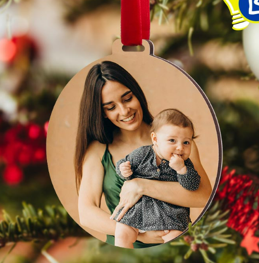 Bola de madera DM de 8 cm personalizada a 1 cara con tu foto. Con lazo y lista para colgar